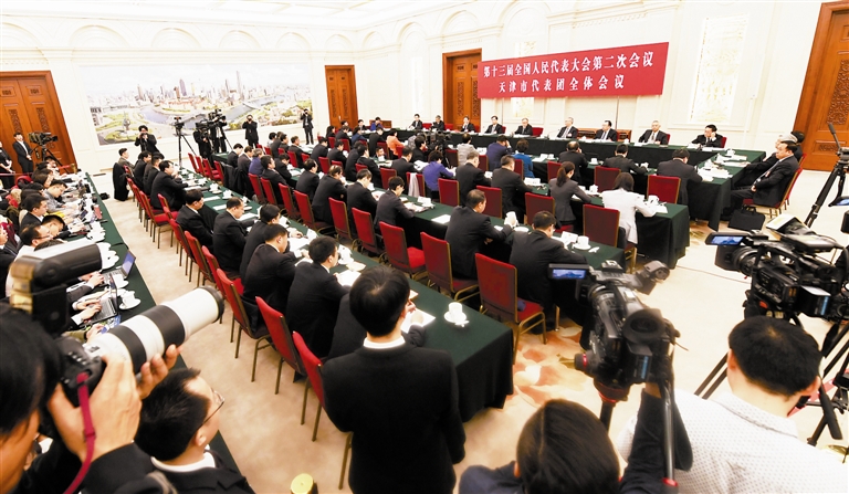 本报北京上午专电(特派记者马庚申 雷风雨)昨天下午,出席十三届全国人大二次会议的天津代表团在人民大会堂天津厅举行全体会议,审议政府工作报告,并向境内外媒体开放。李鸿忠、张国清等代表回答记者提问,段春华主持。