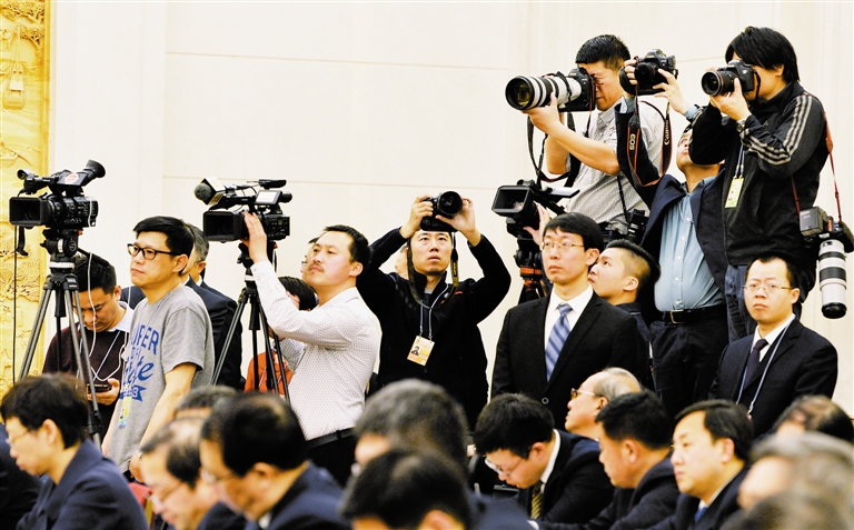 昨天,出席十三届全国人大二次会议的天津代表团在人民大会堂天津厅举行全体会议,并向境内外媒体开放。境内外媒体聚焦天津,现场旁听了天津代表团的审议,并进行了采访。 本报特派记者 尉迟健平摄