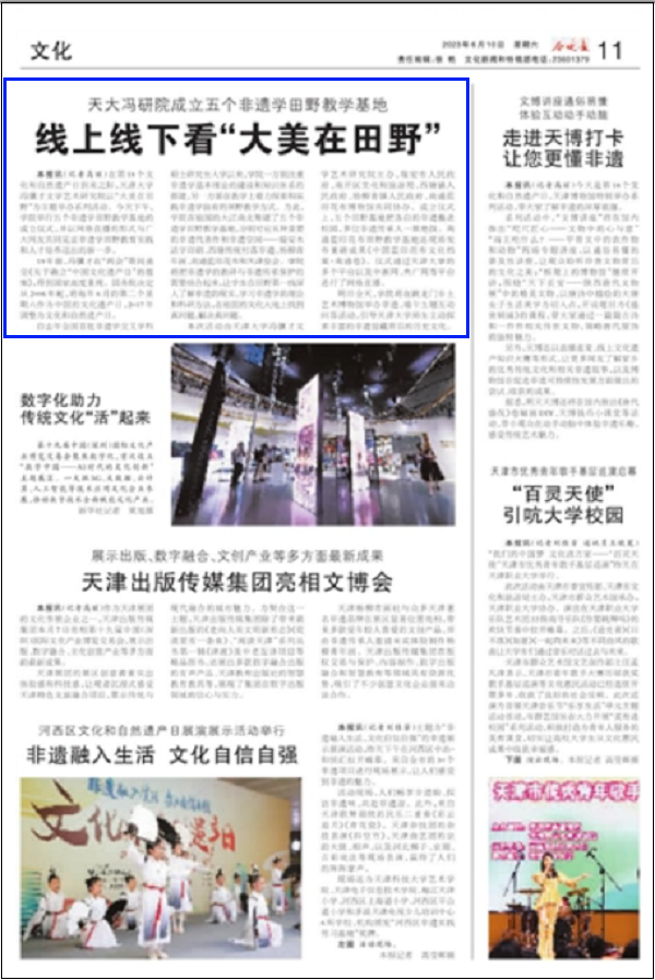 本报讯(记者高丽)在第18个文化和自然遗产日到来之际,天津大学冯骥才文学艺术研究院以“大美在田野”为主题举办系列活动。今天下午,学院举行五个非遗学田野教学基地的成立仪式,并以网络直播的形式与广大网友共同见证非遗学田野教育实践和人才培养迈出的新一步。