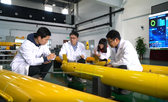 杨绍琼(左二)向团队研究生讲解“海燕”水下滑翔机的工作原理。受访者供图