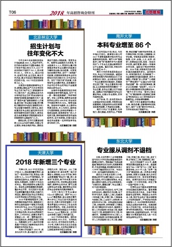 2018年新增智能医学工程、风景园林和海洋科学。智能医学工程专业是我国首个智能方向的医学类本科专业,2018年在全国招生30人。由天津大学和天津医科大学联合培养,毕业后由两校授予医学、工学双学位,成绩优秀者可直接进入本-硕-博贯通式的一体化培养体系,获得医学或工学博士。风景园林(五年)、海洋科学都是基于学校实力雄厚的相关学科新建的本科招生专业。