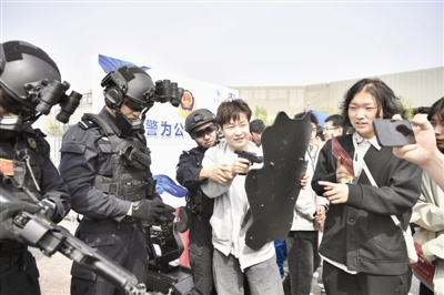 在特警展区,特警装甲车、反恐排爆机器人等“硬核”装备成为现场焦点,特警队员现场演示战术动作与装备操作,学生手持器械,化身“特警队员”完成模拟任务。