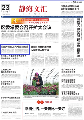 蔺雪峰要求,要坚持思想再解放、改革再深入、工作再抓实,以新发展理念为统领,以科技创新为动力,立足长远,明确发展目标,完善功能布局,科学系统地制定好产业发展规划。要加大政策扶持力度,强化资金、技术、市场、人才等方面的支撑引领,帮助企业开拓市场、留住人才、快速发展。要完善机制、组建专班,明确时间表、路线图、责任人,建立组织,细化分工,挂图作战,全力推动装配式建筑产业规划尽快落实落地,为静海创建国家级现代建筑产业园区奠定坚实基础。