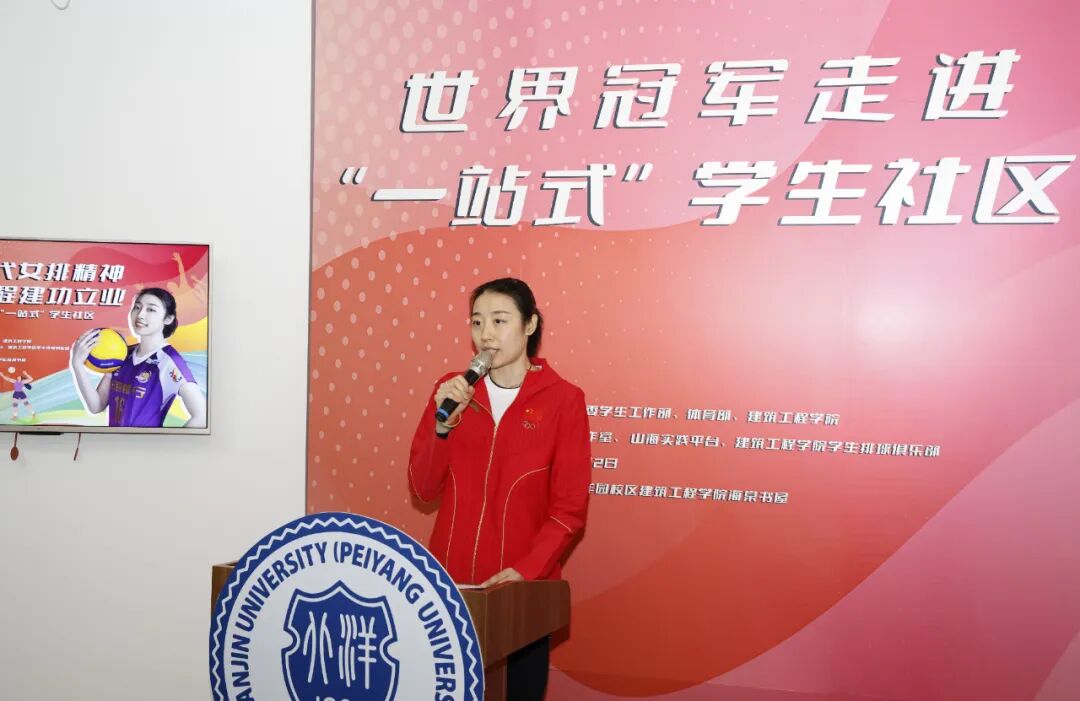 在天津大学“一站式”学生社区齐园15斋“海棠书屋”,天津市体育局和学校领导共同为建工学院一站式体育育人基地揭牌,姚迪还向学校捐赠了她2024年参加世界女排俱乐部锦标赛的纪念球衣。自2021年入选教育部建设试点高校以来,天津大学的“一站式”学生社区以其贴近学生的地理优势,日益成为学校人才培养综合改革的创新场域,学校经常组织专家学者、世界冠军等育人力量下沉学生宿舍一线,在学生喜爱的氛围中开展思想引领,支持成长发展。