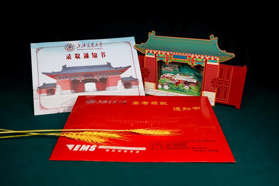 上海交通大学录取通知书正面以“紫气东来门”为背景,“交通大学”四字门匾熠熠生辉。校门卡外形为交大校门,以“交大红”为主色调,采用别出心裁的抽拉纸雕形式,在未拉开时为关闭的平面交大校门形象,拉开时缓缓变为立体五层纸雕,美丽的校园内景也随着校门的拉开而逐渐流露呈现。新生大礼包中,中国工程院院士、上海交通大学校长林忠钦也送上深情寄语,勉励即将入学的学子继承交大传统,磨炼本领、砥砺前行。