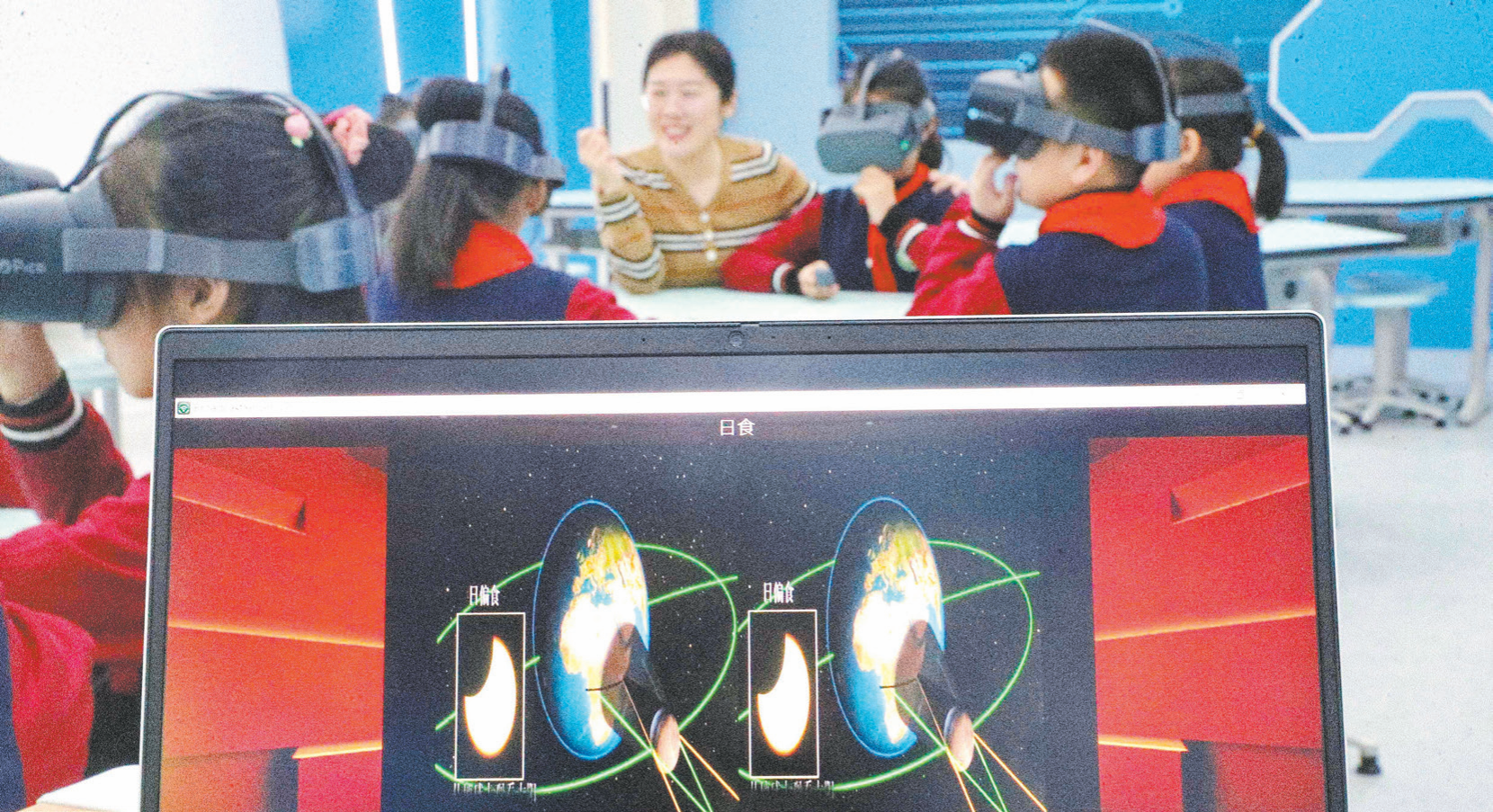 2023年2月,河北秦皇岛,海港区在水一方小学教师为学生播放VR教学自然科学课件。