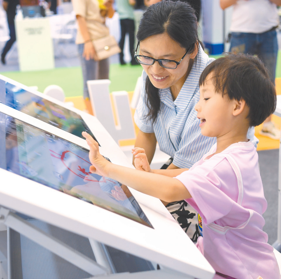 2023年7月,山东省教育装备博览会在济南举行,全国620余家高校、企业、教育机构等参展。图为观众在展会上体验“数字美术课”。