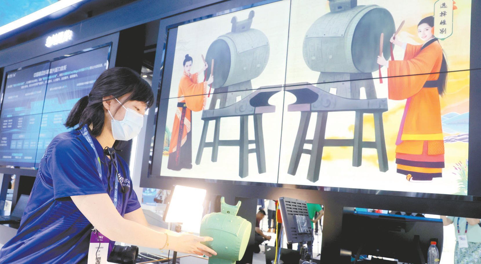2023年6月,第31届中国国际信息通信展览会在北京举行,展示内容延伸至工业制造、医疗、教育、能源等领域。图为参展商展示5G+智慧文博解决方案。
