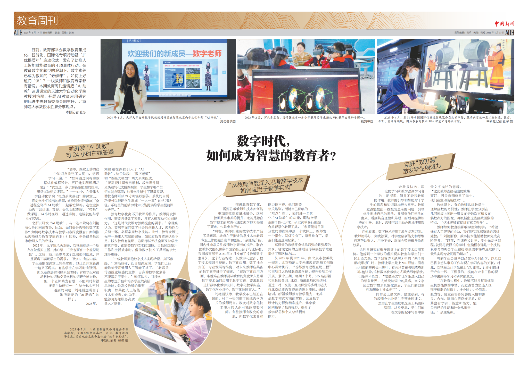 日前,教育部举办数字教育集成化、智能化、国际化专项行动暨“扩优提质年”启动仪式,发布了助推人工智能赋能教育的4 项具体行动。在教育数字化转型的浪潮下,数字素养已成为教师的“必修课”,如何上好这门“课”?一线教师和教育专家都有话说。本期教育周刊邀请把“AI 助教”请进课堂的天津大学自动化学院教授刘艳丽、开展 AI 教育应用研究的民进中央教育委员会副主任、北京师范大学教授余胜泉分享观点。