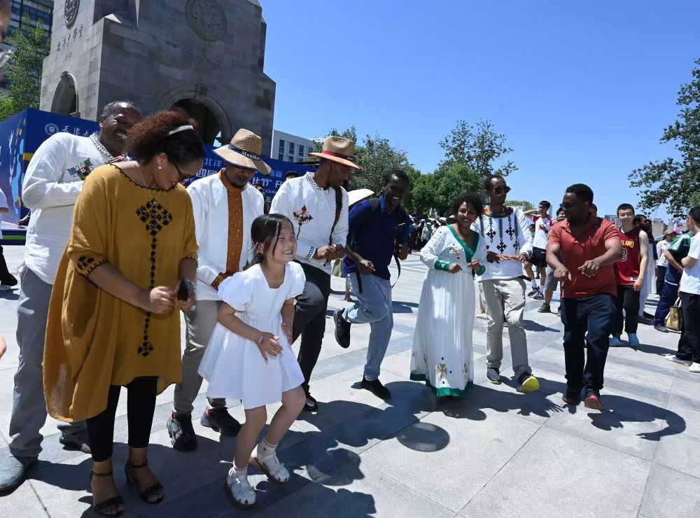5月12日,在天津大学国际文化节,一名小女孩和留学生即兴跳舞。