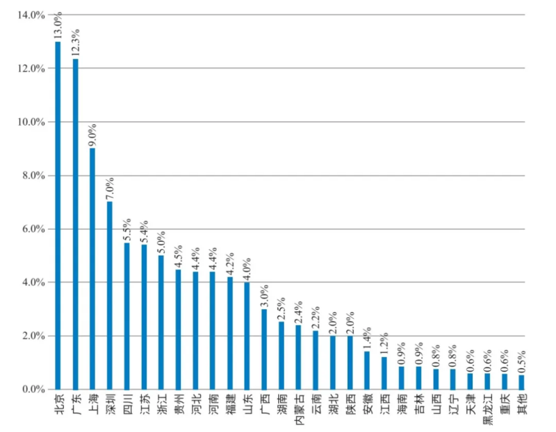 其中,用人单位安全测评人员队伍规模亟需补充,实战型网络安全人才安全测评能力不足。在需求侧,从用人单位安全测评人才所在地域来看,北京、广东、上海排名前三,分别占 13.0%、12.3%、9.0%。数据表明,北上广表现出了人才集聚优势;其他省市安全测评人才分布则相对平衡,产业规模和人才需求在全国分布趋于均匀。