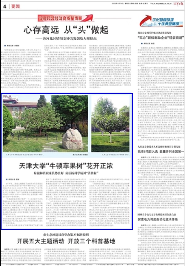 近20年前,天津大学曾为“牛顿苹果树”“扎根”中国做出了一番艰苦的努力。经过多方协调,2007年2月,天津大学时任校长龚克率领的代表团到牛顿的家乡伍尔斯索普庄园,剪下了“牛顿苹果树”的枝条带回国内。由此,这株充满传奇色彩的苹果树被嫁接种植到天津大学,成为我国第一株直接引进的“牛顿苹果树”,供莘莘学子瞻仰。为保证此次移植的“牛顿苹果树”枝条的真实性和合法使用,天津大学与英国林肯郡伍尔斯索普庄园签署了《英格兰伍尔斯索普庄园“牛顿苹果树”枝条捐赠协议》。经过十多年来天津大学专家学者的精心养护,这株苹果树目前生长良好。