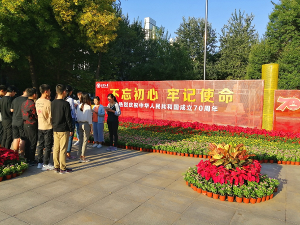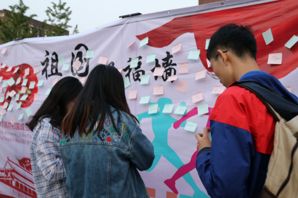 9月22日,机械学院青年志愿者协会联合机械学院18级能动二班团支部,于天津大学北洋园校区书田广场开展“青春告白祖国”活动。近百人在祖国祝福墙上写下自己对祖国的表白,用文字抒发对国家的感激之情。他们还摆出英文“CHINA”和“70”字样,表达自己对祖国的美好祝愿。