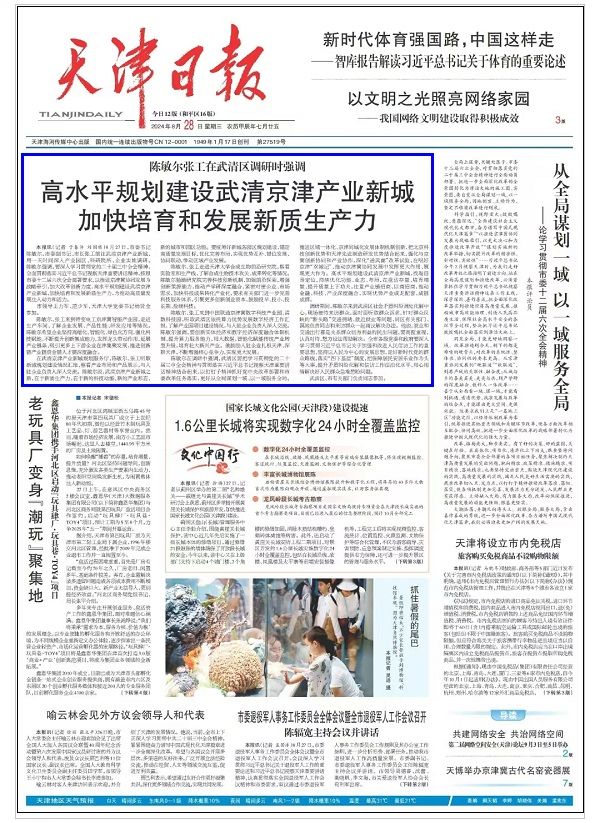 陈敏尔在调研中强调,武清区要把学习贯彻党的二十届三中全会精神与贯彻落实习近平总书记视察天津重要讲话精神结合起来,以钉钉子精神抓好党中央改革部署和市委改革任务落实,更好从全局谋划一域、以一域服务全局。推进区域一体化、京津同城化发展体制机制创新,把北京科技创新优势和天津先进制造研发优势结合起来,强化与京冀创新协同和产业协作,深化“通武廊”改革试验,在唱好京津“双城记”、推动京津冀协同发展中发挥更大作用、展现更大作为。高水平规划建设武清京津产业新城,找准自身定位,持续优化功能、业态、布局,在盘活存量、培育增量、提升质量上下功夫,注重产业链招商、以商招商,推动金融、科技、产业深度融合,实现优势产业成龙配套、成链成群。