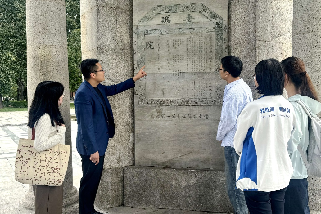 天津大学法学院薛杨教授为新生准备了一场别开生面的“中秋Walk”,在北洋广场“钦字第一号考凭”石雕前,他庄重讲述了“中国第一张大学文凭”所有者、北洋大学法科先贤王宠惠的生平故事。“薛老师还结合他参与《科学家生物安全行为准则天津指南》起草的经历,给我们上了一堂生动的涉外法治实践课.我们为天津大学牵头这份首个以中国地名命名、内容以中国倡议为主的生物安全国际倡议深感自豪,也坚定了提升参与国际法务能力、投身涉外法治建设的决心!”法学院硕士生周鸿佚说。