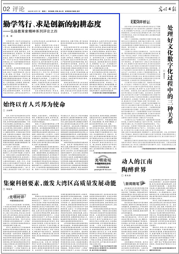创新是教育家修学育人的目标追求,代表着突破传统束缚、努力寻找新思路和解决新问题的能力。创新是应对时代之变的必然要求,只有不断开拓进取,才能从容应对日益复杂多变的社会发展需求。广大教师不仅自身要葆有创新意识,也要呵护学生的创新潜能,在他们心中种下创新的种子。在教育教学方面,广大教师要勇敢尝试新的教学方式和手段,密切关注教育前沿理论和实践,及时更新知识储备与教学观念,引领学生掌握新知、探索学术前沿,重视激发学生的创造力和想象力,努力培养学生的创造性思维和解决问题能力。在科学研究方面,广大教师群体应始终秉持追求卓越、追求长远、追求原创的态度,坚持服务国家重大战略需求,勇闯科技“无人区”,为实现高水平科技自立自强,建成教育强国、科技强国、人才强国贡献更大力量。