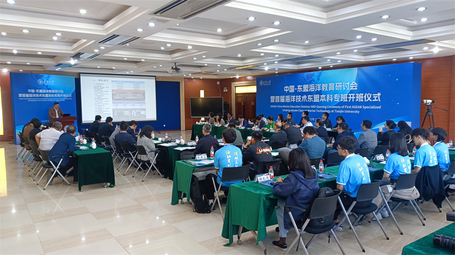 中宏网天津10月14日电 10月14日,中国-东盟海洋教育研讨会暨海洋技术东盟专班开班仪式在天津大学举办,来自中国-东盟中心、马来西亚驻华大使馆、天津市教委,以及生态环境部卫星环境应用中心等10余家国内涉海科研院所的嘉宾出席会议,来自马来西亚的15名留学生参加了开班仪式。
