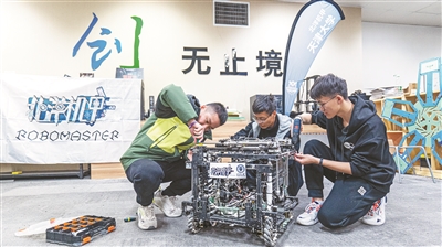 天津大学学生动手进行机器人装车。方典 摄