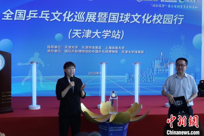 中新网天津9月21日电 (张少宣)21日,由天津大学、天津市体育局、上海体育大学指导,国际乒联博物馆和中国乒乓球博物馆(以下简称“乒博馆”)以及天津大学体育部承办的“全国乒乓文化巡展暨国球文化校园行(天津大学站)”全国科普日活动在天津大学开幕。