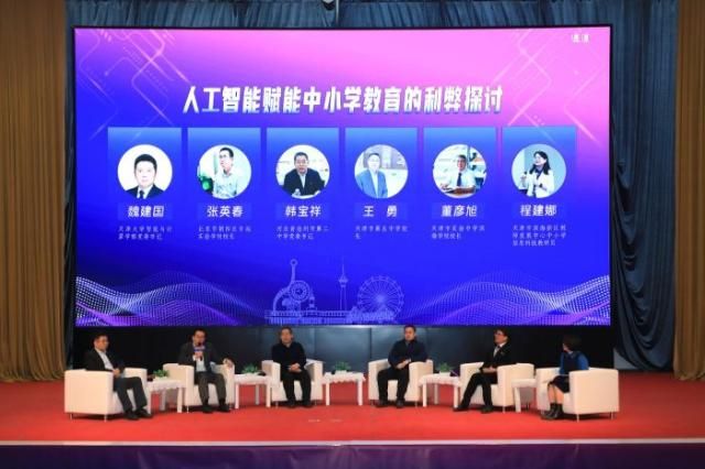圆桌论坛环节围绕“人工智能赋能中小学教育的利弊探讨”主题展开,天津大学智能与计算学部党委书记魏建国、北京市朝阳区日坛实验学校校长张英春、沧州市第二中学党委书记韩宝祥、天津市第五中学校长王勇、天津市实验中学滨海学校校长董彦旭分别围绕“管”“教”“学”,以不同观点和多元视角进行了深度思辨。