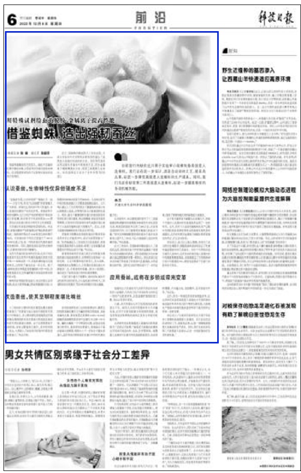虽然天然蚕丝的生物特性优异,但其平均抗拉强度却不及自然界中机械性能最优异的天然丝纤维——蜘蛛丝的一半,其他机械性能也远逊于蜘蛛丝,这限制了蚕丝的进一步应用。据了解,蜘蛛丝的拉伸强度是普通钢的3倍—5倍,总体韧度是凯夫拉这种通常被用来制造防弹衣的材料的5倍。