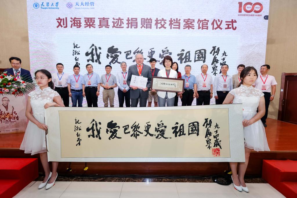 会上还举办了意义非凡的捐赠仪式:重庆大学将刘豹先生本科时期花名册、成绩单、毕业证等史料捐赠给天津大学档案馆;刘豹先生弟子、天津大学原副校长寇纪淞特把刘豹先生父亲刘海粟先生题字真迹《我爱巴黎更爱祖国》无偿捐赠学校,以表达对刘海粟老先生的崇高敬意和对刘豹先生的无限怀念。未来,刘海粟先生真迹将作为重点文物永久保存到天津大学档案馆。