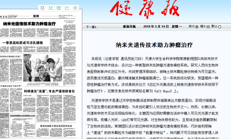 本报讯(记者李哲 通讯员赵习钧)天津大学生命科学学院常津教授团队将纳米技术与光遗传学技术结合,设计出一种新型纳米抗肿瘤光遗传操控系统。研究人员向生物体表面照射脉冲式近红外光,光线穿透深层组织,被稀土纳米颗粒接收转换为可见蓝光,进而激活光感蛋白,最终精准触发肿瘤细胞凋亡。这一系统的成功研发,有望提供一种恶性肿瘤治疗新方式。该成果相关论文《近红外光激活的上转换光遗传学纳米系统用于肿瘤治疗》,近期发表在纳米领域知名期刊《ACS Nano》上。