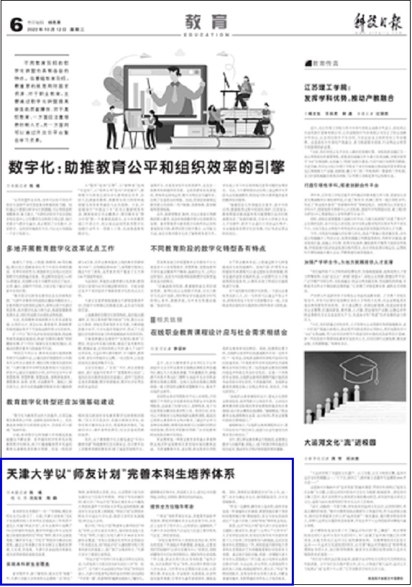 原本研究生专属的“一对一”导师制,现在本科生也可以享受了。日前,天津大学发布了《关于加强跨学院大类本科生思想政治工作的若干意见》,实施“师友计划”,在专业教师中选聘了730位师德师风高尚、教学科研能力和专业指导能力较强的教师担任“师友”导师,使学生全面客观地了解所学专业,“手把手”帮助学生解决实际困难,通过言传身教引导学生树立正确的世界观、人生观、价值观。天津大学2022级本科新生成为该项举措的首批受益者。