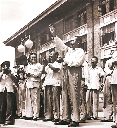 毛泽东在天大视察的消息不胫而走,一万多名师生员工自发地齐聚第九教学楼门前广场,高喊“毛主席万岁”“中国共产党万岁”。随后,毛泽东来到第九教学楼门前平台上接见了广大师生群众,并挥手致意。这张宝贵的照片就是拍摄于此时。