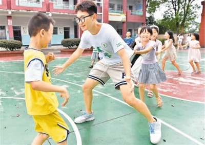 2022年暑期,武汉大学的大学生志愿者来到江西省南昌市湾里管理局罗亭镇义坪小学参加“童心港湾”关爱留守儿童活动。图为志愿者和留守儿童一起做游戏。