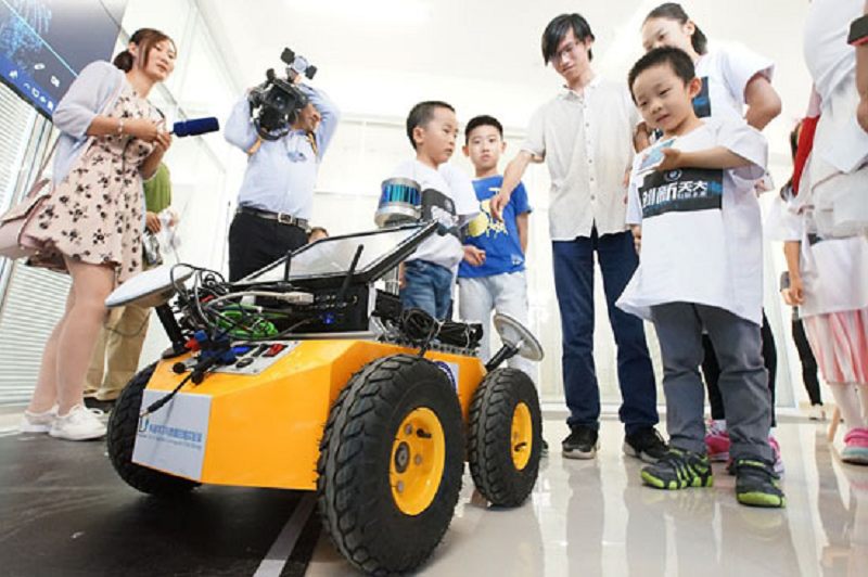 在随后的体验中,小记者们了解到,无人机可以通过机载摄相机智能监视路况,抓拍交通违章行为,追踪特定目标;无人驾驶汽车能够凭传感器进行数据分析,确认周边车辆和行人状况,自动避让。无人小车模型更是吸引了孩子们的兴趣。小朋友可以通过手机软件,用语音控制小车,让它做出前进、后退、转弯、停止等动作。孩子们围着小车的玩得不亦乐乎。现场还有一个小机器人,它可以陪小朋友们聊天,还可以根据指示做出挥手之类的动作。
