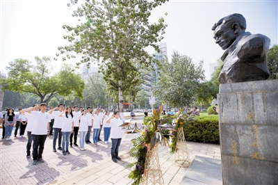 上图 上午,天津大学太雷班学生在校园烈士塑像前宣誓。本报记者 江 珊文 王晓明摄