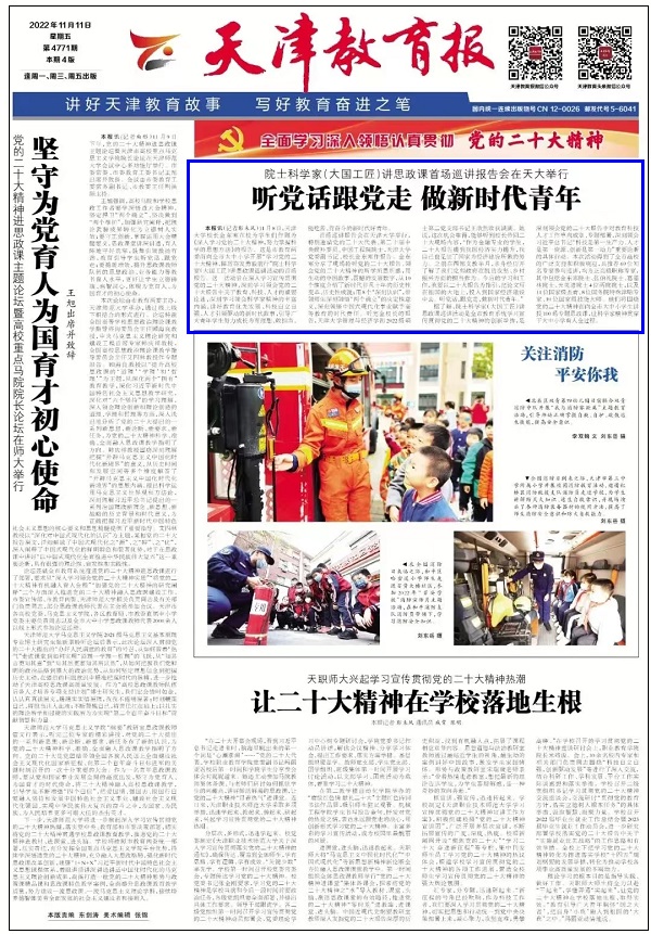 本报讯(记者 彭未风)11月8日,天津大学校长金东寒在校为学生们作题为《深入学习党的二十大精神,努力掌握科学的思想方法》的报告。这是市教育两委面向全市大中小学开展“学习党的二十大精神,踔厉奋发勇毅前行”院士科学家(大国工匠)讲思政课巡讲活动的首场报告。这—活动旨在深入学习宣传贯彻党的二十大精神,深刻学习领会党的二十大报告中关于教育、科技、人才的重要论述,深刻学习领会科学家精神的丰富内涵,讲好教育优先发展、科技自立自强、人才引领驱动的新时代故事,引导广大青年学生努力成长为有理想、敢担当、能吃苦、肯奋斗的新时代好青年。