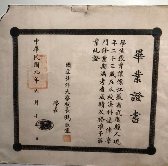 毕业证书上写有:“学生张曾让系江苏省武进县人,现年二十三岁,在本校法科法律学门修业期满,考查成绩及格,准予毕业,此证。”签发人是校长冯熙运,时间是1920年6月15日。