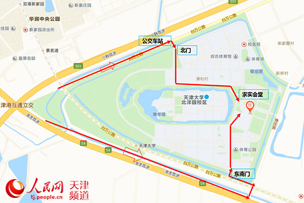 出租车或自驾:需要从天津大学北洋园校区北门或东南门驶入,地图导航输入:“天津大学求实会堂”即可。