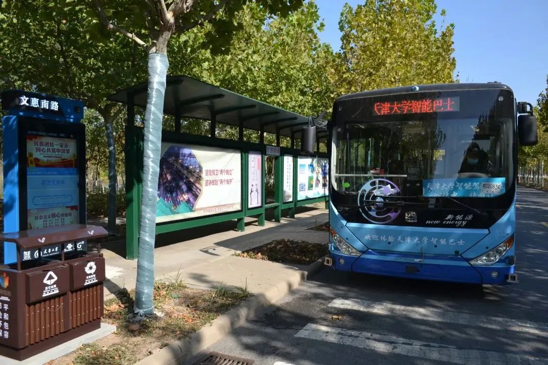 智能公交开放测试第一阶段设天津大学东门、天津大学南门、南开大学西门、海教园管委会、文慧南路、管理中心、实训中心、机电职业学院、商务职业学院等站点。