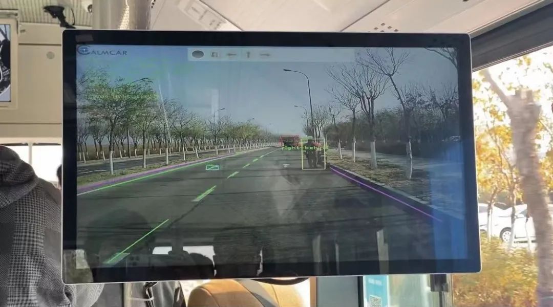 为了让大家能更直观,天津大学无人驾驶交叉研究中心团队在车厢里设置了三块屏幕,屏幕上用不同颜色标出了所在道路的边缘线,两侧路过的车辆、行人则用不同颜色的方框标出,天津大学无人驾驶交叉研究中心主任谢辉为记者进行了详细介绍:“这个屏幕给大家看到的是我们的感知系统的探测效果图,车道线你看是白色的线,我们探测出来以后,我们就会画上我们的标线,旁边的那个红线是道路边缘,它要根据三维特征,探测出来以后能够告诉车辆路边在哪。旁边的车辆、行人探测出来是三维的,它既能看到平面的尺寸,也能看到纵深的尺寸。”
