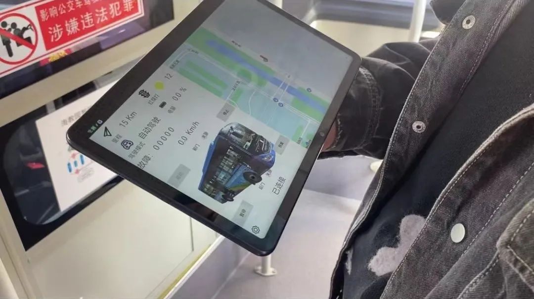 上车后,咱坐稳扶好再参观这辆车也不急。因为它毕竟还是“新手”,起步的时候还是有点“楞”。而且这台公交车的起步,是由一台ipad控制的。记者在车厢内粗略扫视了一圈,一打眼看上去和普通公交差异不大,座位设计的格局、拉手、还有前后门的安排基本一致。