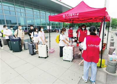 天津医科大学新生陆续抵达迎新接站点。 本报记者 谷岳 摄