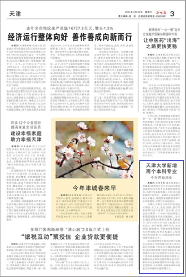本报讯(记者李杨 通讯员王红玉 刘晓艳)教育部近日公布2023年度普通高等学校本科专业备案和审批结果,天津大学获批机器人工程、供应链管理两个新专业。新增专业均体现学科交叉融合,围绕国家战略需求和产业发展趋势,并将自今年起招生。