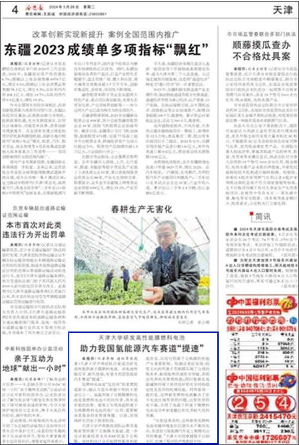 本报讯(记者 李杨 通讯员 焦德芳)天津大学尹燕团队日前成功研发高性能阴离子膜燃料电池。该电池性能优异、耐久性强,有望为我国氢能源汽车赛道“提速”。