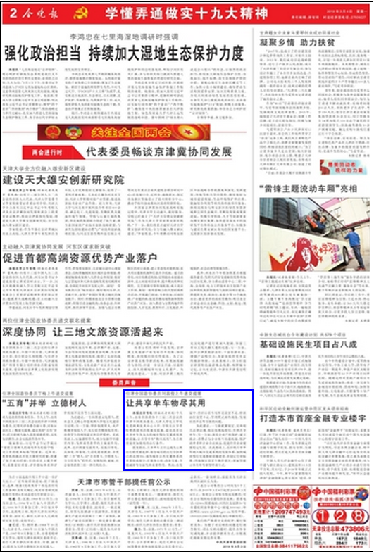 本报北京专电(特派记者刘超)今天上午,出席全国政协十三届二次会议的住津全国政协委员,天津大学化工学院先进纳米技术中心主任刘昌俊递交提案,建议改善以共享单车为龙头的城市慢行交通系统基础设施,让共享单车“物尽其用”,为百姓营造更加便利的出行条件。 提案指出,共享单车正日益成为百姓出行的重要选择,部分城市的出行分担率已经达到5%,成为城市公共交通体系的重要组成部分,在服务百姓、改善交通、节能减排等方面发挥重要作用。然而,在发展中,仍旧存在专用车道设置不足、停放泊位设置不足、管理模式亟待规范、发展后劲不足等方面的问题。