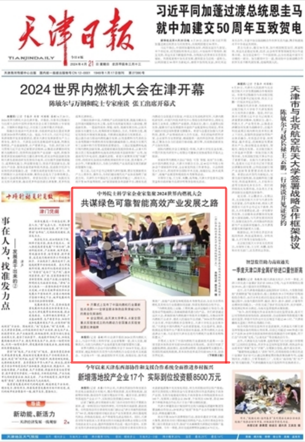 本报讯(记者 姜凝)昨日在津开幕的2024世界内燃机大会上,与会中外院士和科学家、企业家集聚一堂,深入交流、凝聚共识,为助力内燃机产业高质量发展贡献智慧和力量。