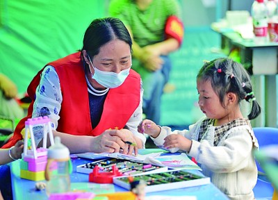 四川雅安芦山县太平镇太平中学安置点,志愿者在教小朋友画画。新华社发