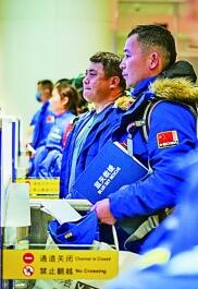蓝天救援队队员准备登机前往土耳其伊斯坦布尔,驰援地震灾区。新华社发