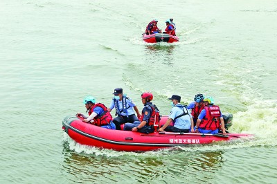 江苏宝应县公安局水上派出所、射阳湖派出所联合蓝天救援队员在射阳湖镇辖区水域内开展水上实战救援训练。沈冬兵摄/光明图片