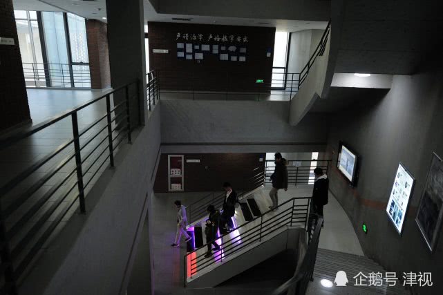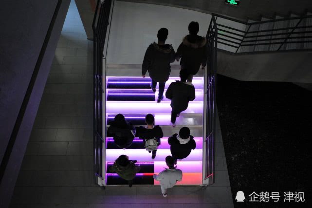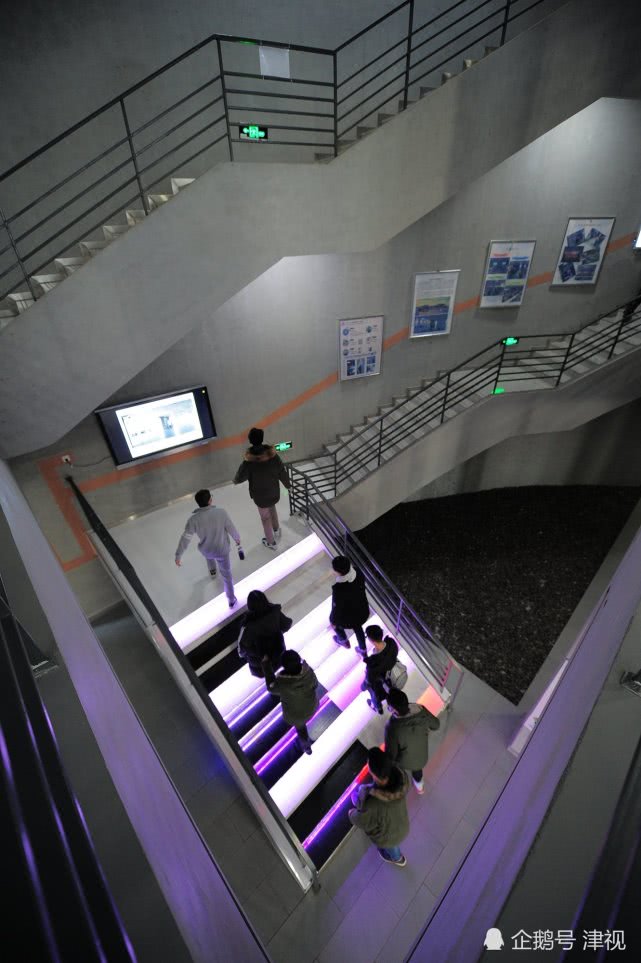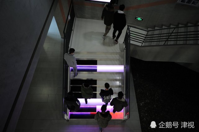 这是位于天津大学北洋园校区的电气电子实验教学中心,教学楼内的阶梯,是钢琴琴键的设计,每一步都是一个音符,伴随着氛围灯光,每次上下阶梯,都是一次奏乐的体验。