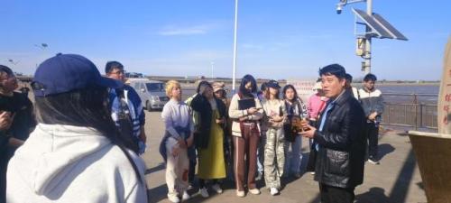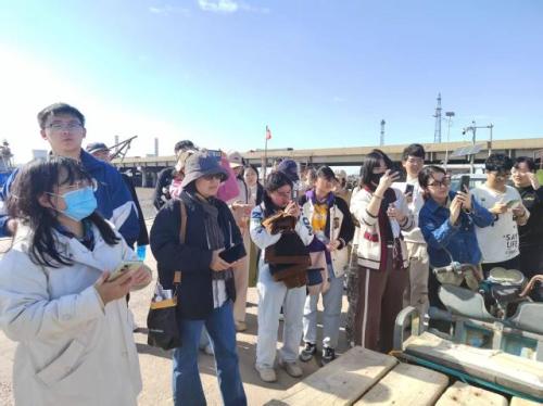 在“津门第一缕曙光纪念石”下,天大学子们纷纷合影留念,拍摄记录光影,寨上街道和大神堂村干部现场为大家讲述海味浓郁的“非遗”故事。当了解到渔家号子独特魅力时,00后学子们仿佛触摸到声音景观的震撼。“原来渔民的号子不是表演,是他们协调拉网节奏的生存智慧!”他们一边记录一边感叹。张蕾现场引导学生关注细节:“注意观察渔具样式、船对款式,这些流淌在渔民指尖的美学,正是寨上街独有的盐渔文化基因。”