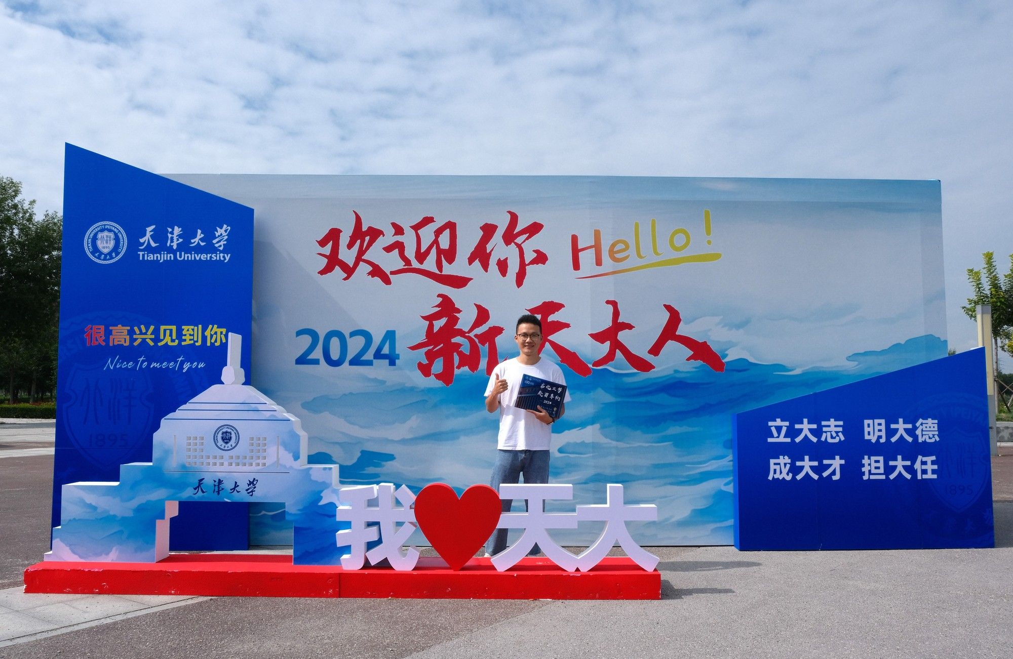 在材料学院迎新点,2024级工程博士付春雨带着父母、妻子和两个女儿一起来报到,其中小女儿只有42天。完成报到手续后,志愿者为这一家人拍下了全家福。1987年出生的付春雨已经37岁,在北京卫星环境工程研究所工作,为了提升自己,他选择继续到天津大学攻读博士。