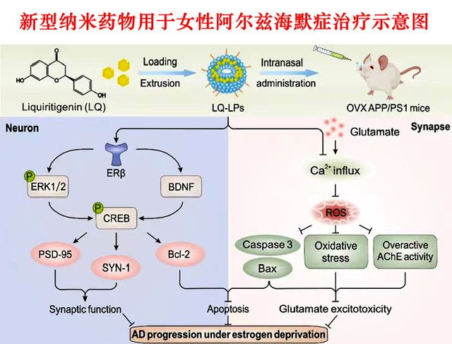 天津大學生命科學學院常津教授與天津醫科大學總醫院竇妍副研究員合作,首次基於植物雌激素甘草素研發了一種多功能納米藥物,實現對絕經後女性阿爾茲海默症的特異性治療。該納米藥物能夠一定程度激活特異性雌激素受體介導的神經保護信號通路,顯著改善雌激素缺失導致的氧化應激、膽鹼能異常、神經元損傷和突觸功能障礙。